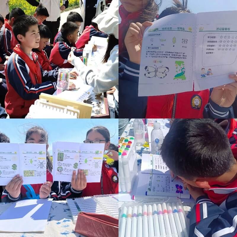 知識(shí)講解結(jié)束后,學(xué)生們充分發(fā)揮各自的想象力,在手冊(cè)上用五彩斑斕的畫筆為蚜蟲、菜青蟲以及菜粉蝶精心涂色,創(chuàng)作的作品各具特色,有人將蚜蟲畫成“彩虹戰(zhàn)士”,有人為菜粉蝶添上科幻翅膀,童趣創(chuàng)意讓科技與藝術(shù)交融,展現(xiàn)出他們對(duì)所學(xué)昆蟲的獨(dú)特理解。最后,全體學(xué)生深入田間,近距離觀賞大片盛開的油菜花,尋找幼嫩菜莢、對(duì)比健康與病害植株,親身感受大自然與農(nóng)業(yè)知識(shí)融合的魅力。