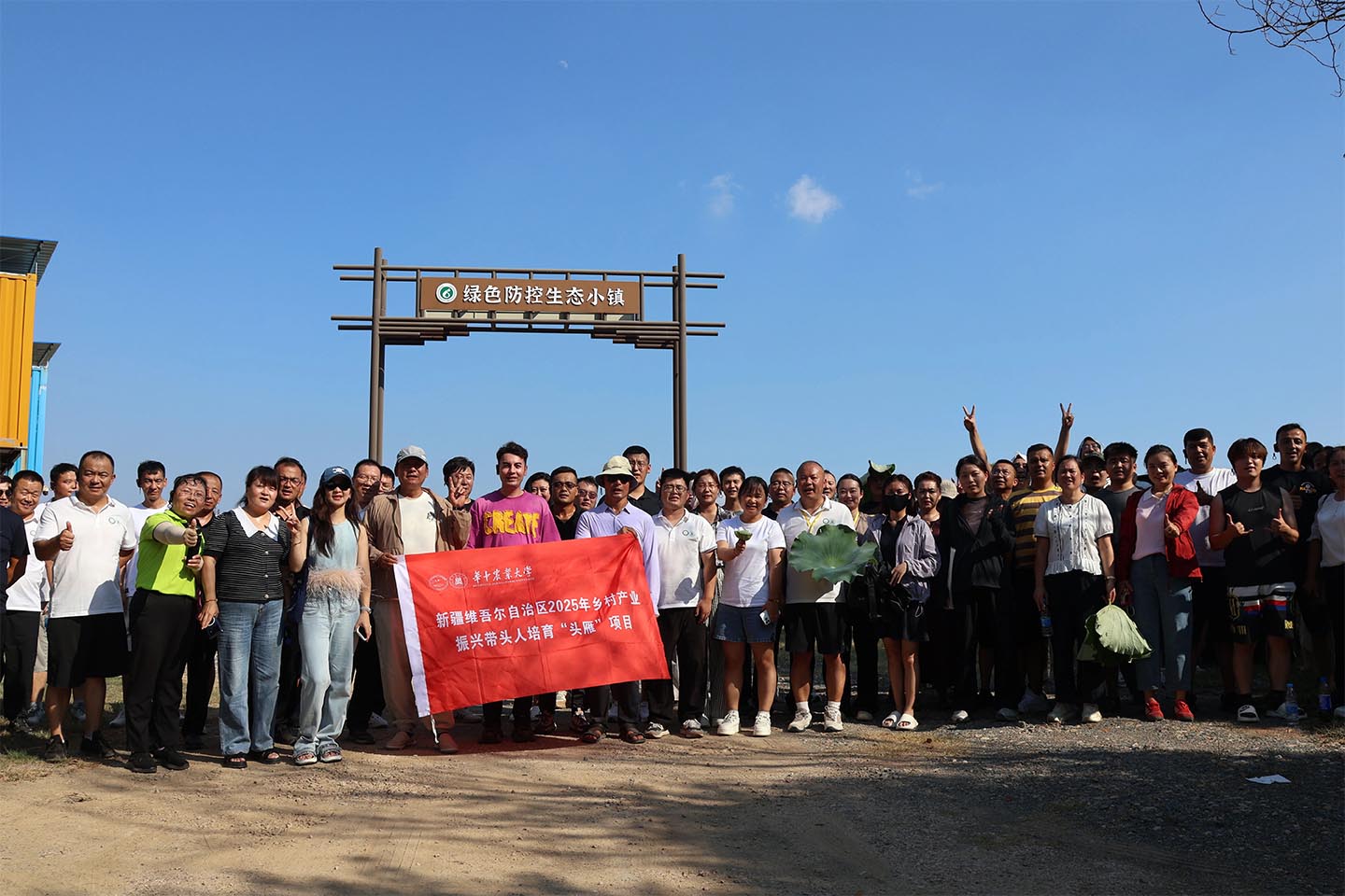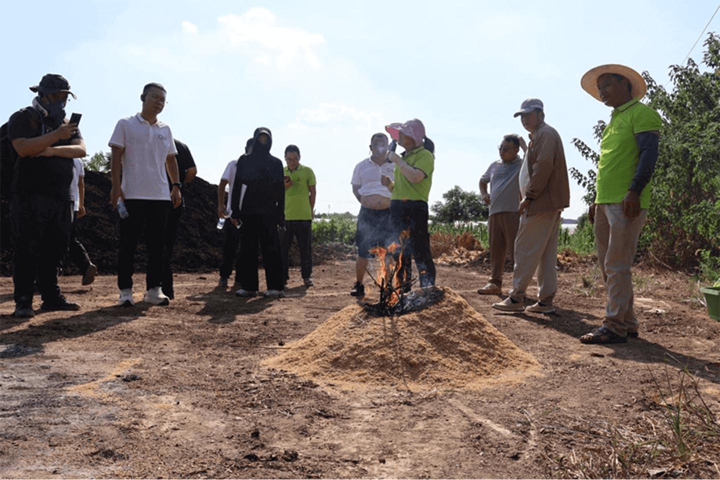 隨后,在烈日高溫下,陳博士帶領(lǐng)學(xué)員們到武大綠洲綠色防控生態(tài)小鎮(zhèn)實(shí)地學(xué)習(xí)“綠色防控5+2體系的每個(gè)應(yīng)用場(chǎng)景”。小鎮(zhèn)技術(shù)員鄭老師現(xiàn)場(chǎng)介紹了堆肥配比和制作過程并演示了簡(jiǎn)易稻殼碳化處理方法,陳博士結(jié)合演示過程,詳細(xì)講解了稻殼資源化利用的創(chuàng)新路徑:通過高溫炭化技術(shù),將農(nóng)業(yè)廢棄物稻殼轉(zhuǎn)化為炭基有機(jī)肥,不僅實(shí)現(xiàn)了秸稈減量化處理,其產(chǎn)物還可提升土壤透氣性、保水性及肥力,有效減少化肥使用量,助力碳達(dá)峰碳中和目標(biāo),新疆“頭雁”學(xué)員對(duì)其表示濃厚的興趣。